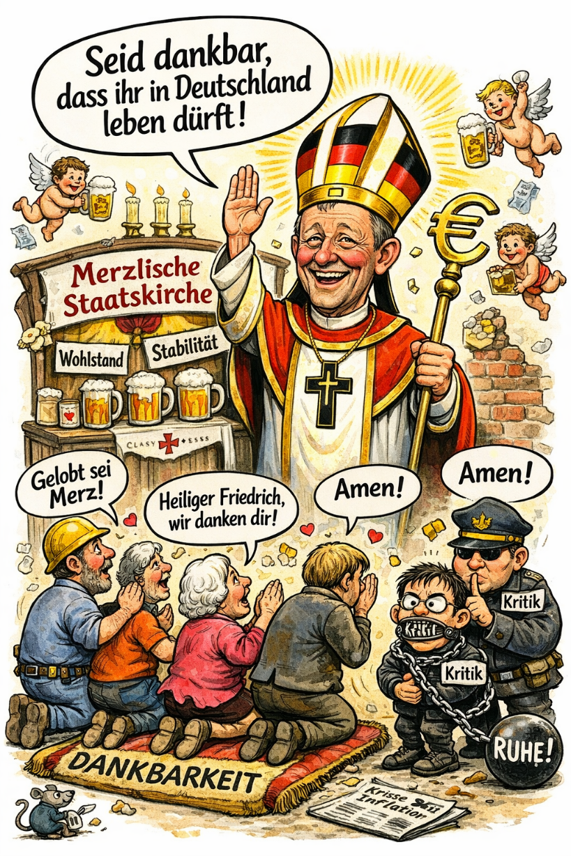 Der jüngste Anlass: Eine Veranstaltung der FAZ, bei der der Kanzler – ganz Staatsmann, ganz Prediger – verkündete, wir könnten „dem Herrgott dankbar sein“, hier zu leben. Ein Satz wie aus dem Poesiealbum der Republik, irgendwo zwischen Sonntagspredigt und Regierungserklärung.