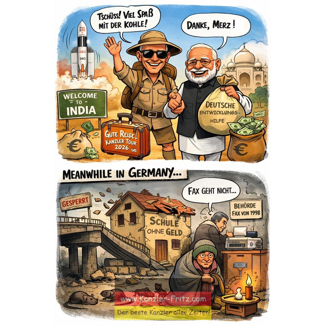 Friedrich Merz war also mal wieder unterwegs. Indien. Modi. Große Bühne, große Worte, große Fotos. Der Kanzler reist, winkt, lächelt, nickt bedeutungsschwer – und irgendwo zwischen Neu-Delhi und dem nächsten Pressefoto fragt man sich: Hat eigentlich jemand in Berlin das Licht angelassen?